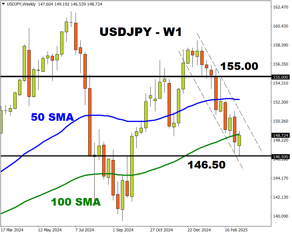 Looking at the weekly charts, the USDJPY is respecting a bearish channel – but support can be seen at 146.50.