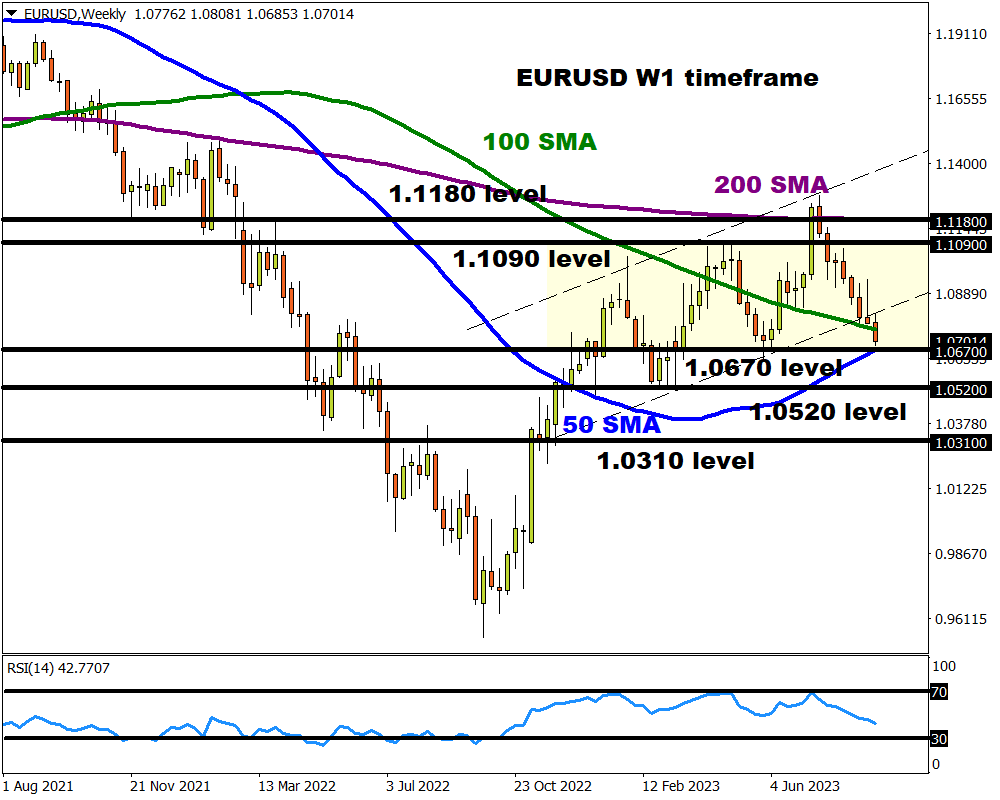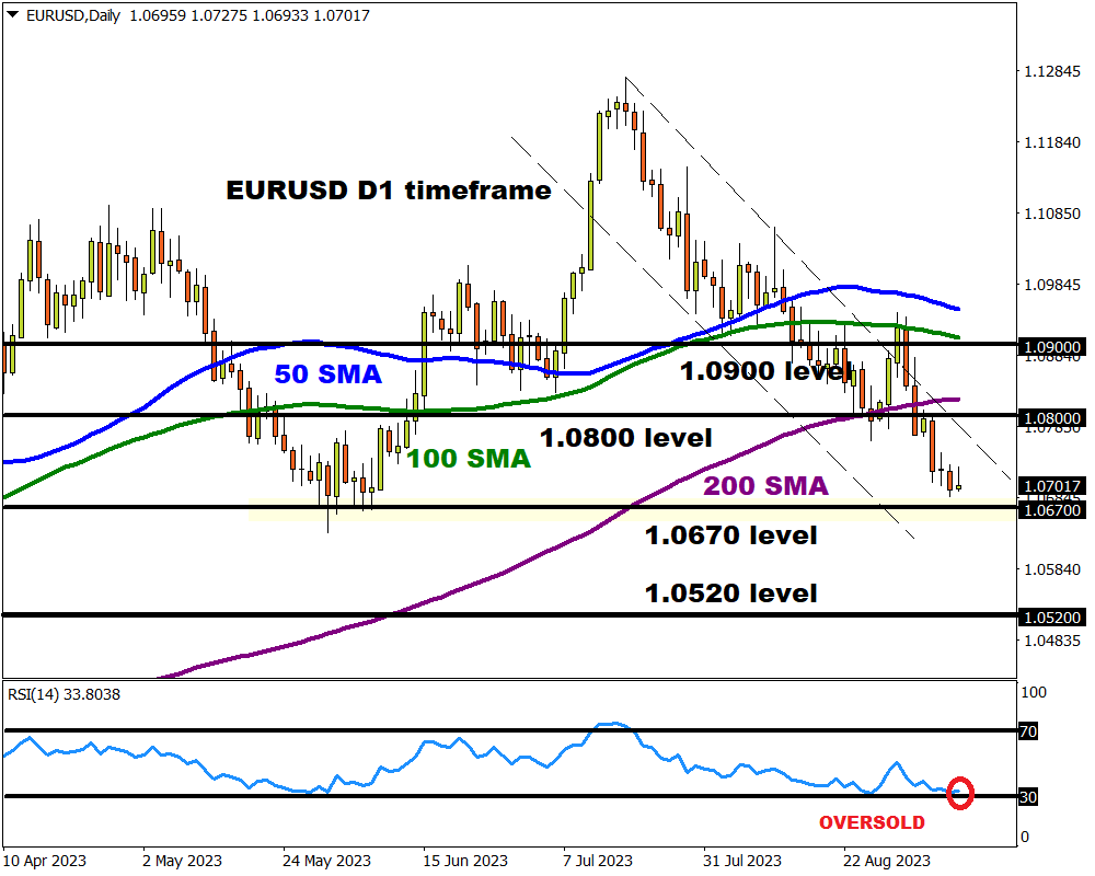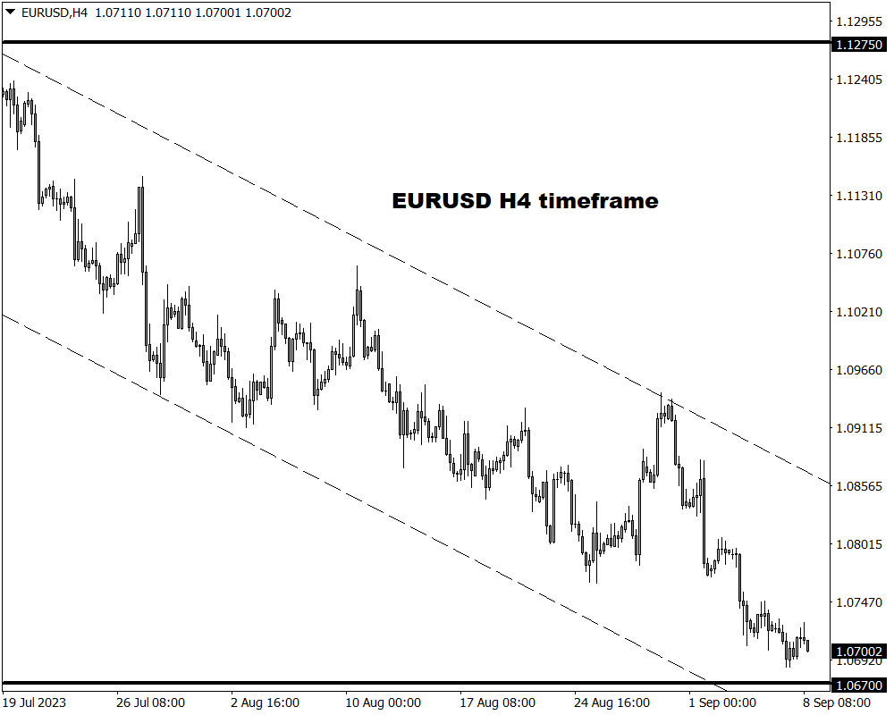 Before we dissect the factors that could trigger a significant move in the EURUSD, it’s worth noting that prices remain heavily bearish on the H4 charts. The euro has shed over 1% against the dollar since the start of September with prices approaching key support at 1.0670. The events in the upcoming week may dictate whether prices experience a breakdown or rebound.