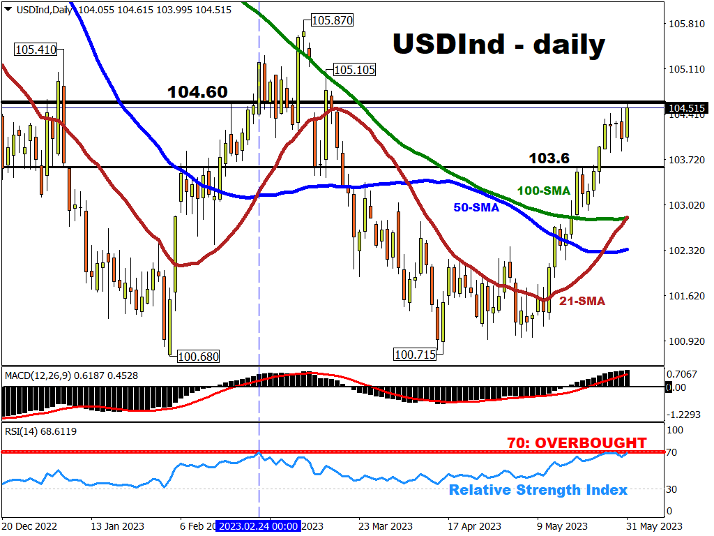 The USD Index has punched its way to a fresh two-month high, and is on course for its largest monthly gain (2.8%) since September 2022.