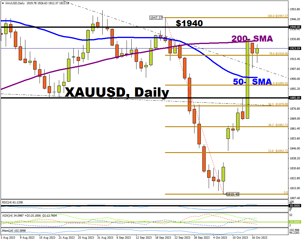and the 78.6 Fibonacci level at $1918.06, when drawn from September 20th’s high of $1947.37 to October 6th’s low at $1810.40, is currently acting as support.